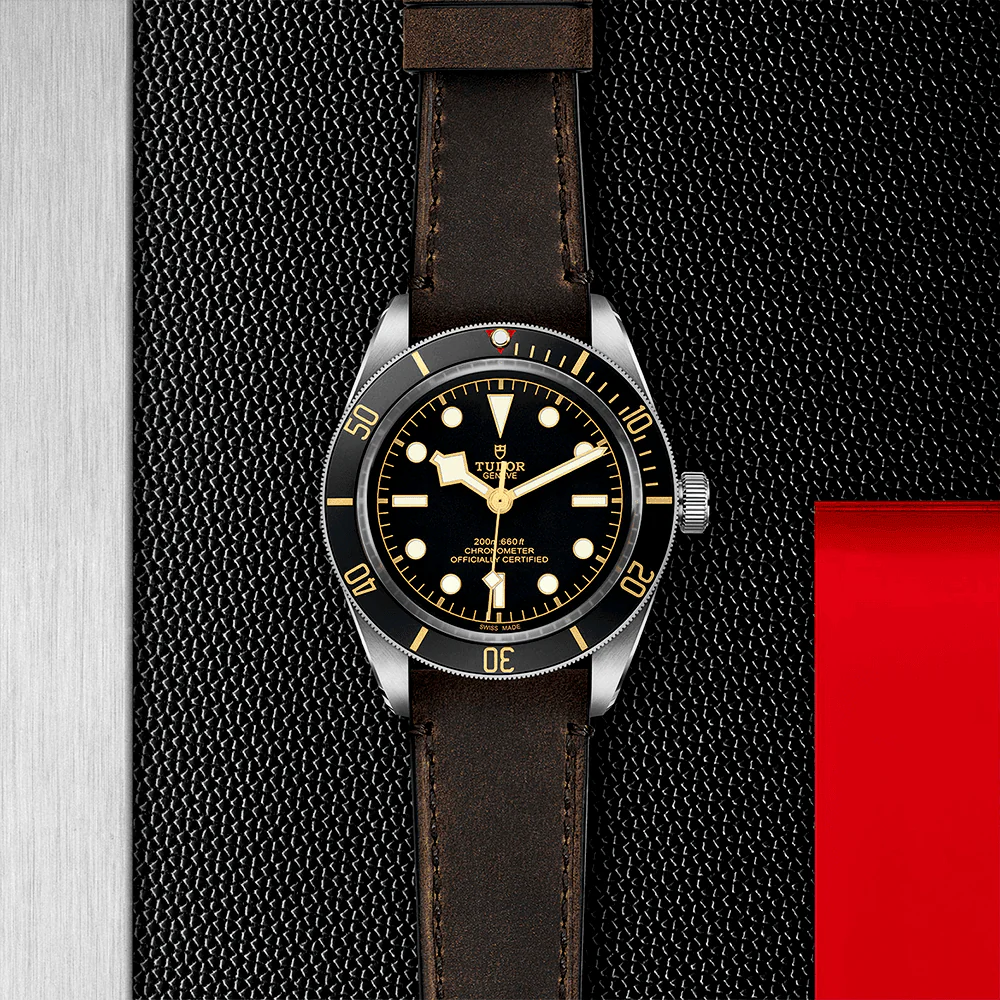 Paying tribute to their first very own diver’s watch collection, Tudor’s Black Bay Fifty-Eight watches are superbly crafted with dimensions that evoke the epoch. Despite its bold and rugged design, the Black Bay Fifty-Eight watch is tailored to suit the needs of a slender wrist. Its black dial is home to chunky hour markers and hands. Gold gilded Features on the bezel are matching with the minute scale around the flange of the watch, and an intricately crafted in-house movement powers this watch in true Tudor style. The dial is protected by a lens crafted from anti reflective and scratch resistant sapphire crystal, attached to a 200-meter water resistant stainless steel case that spans a diameter of 39mm on the wrist. Inside the watch is the self-winding Calibre MT5402 – a movement that is COSC-certified and capable of a 70-hour power reserve. The unidirectional steel bezel of this Tudor Black Bay Fifty-Eight watch is complete with black anodised aluminium 60 minute graduated scale. As well as a steel screw-down winding crown embellished with the Tudor crown logo in relief, this Black Bay watch is also completed on a stylish brown leather strap with a folding clasp and safety catch that donates a retro-inspired look to this ultra-reliable model.