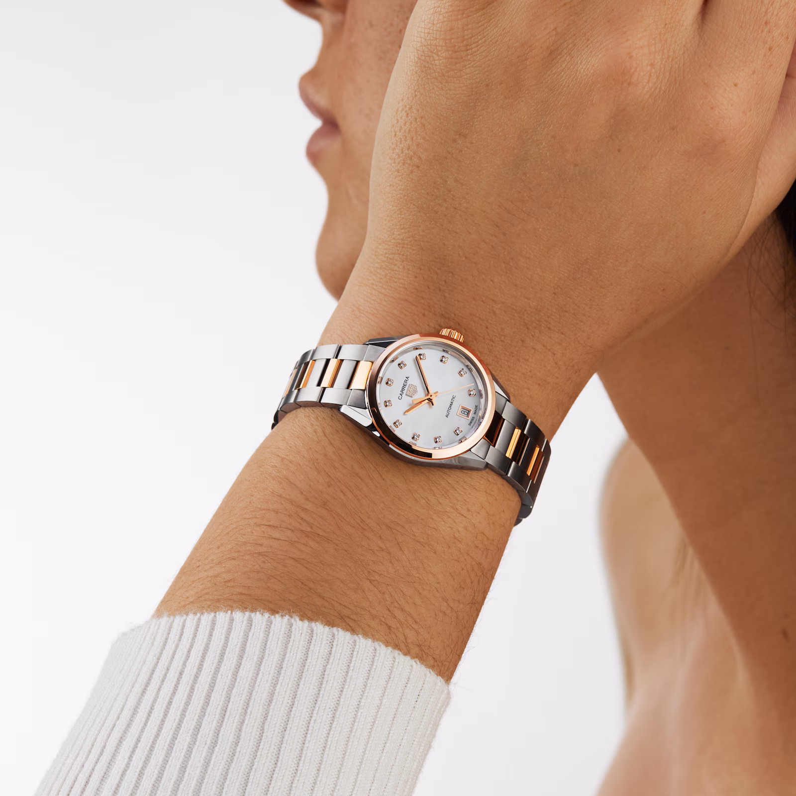 Offering a luxurious touch, the white mother of pearl dial is framed by an 18ct 5N solid rose gold bezel and elevated by 11 diamond indexes. The dial also features a date display alongside delicate 18ct 5N rose gold plated hands.