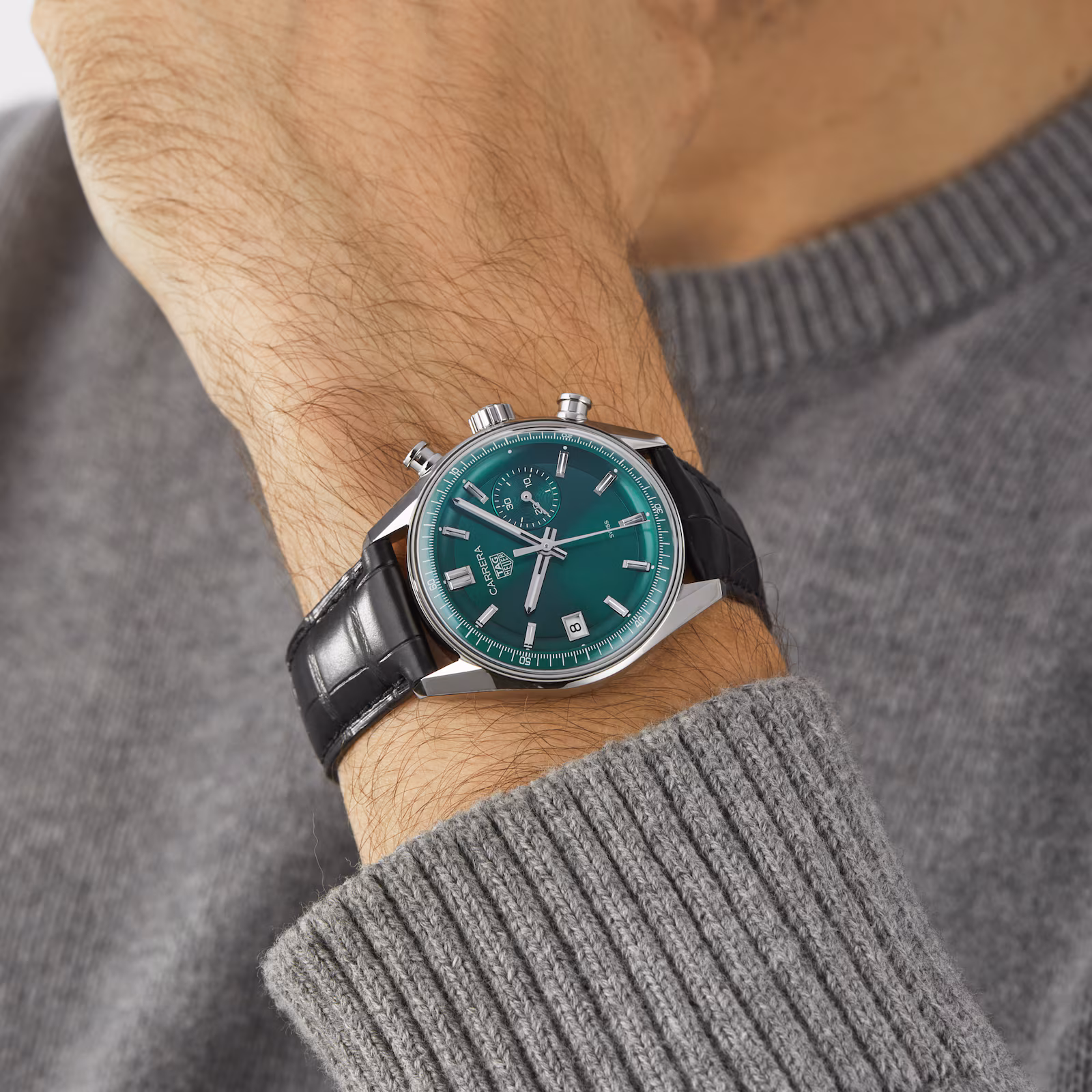 Encapsulating the daring spirit of the collection's 60th anniversary, this Carrera model features a 39mm steel case paired with a luxurious black alligator leather strap.