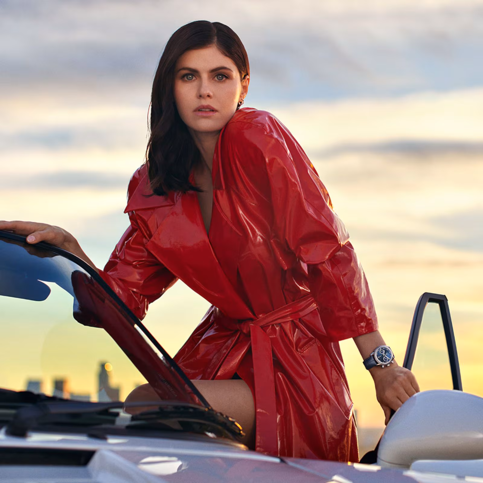 With its 39 mm silhouette, this TAG Heuer Carrera timepiece Chronograph captures the essence of femininity and racing spirit. Featuring a soft pink dial set against the brilliance of diamonds, it encapsulates a luxurious, sporty aesthetic.