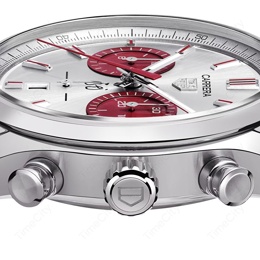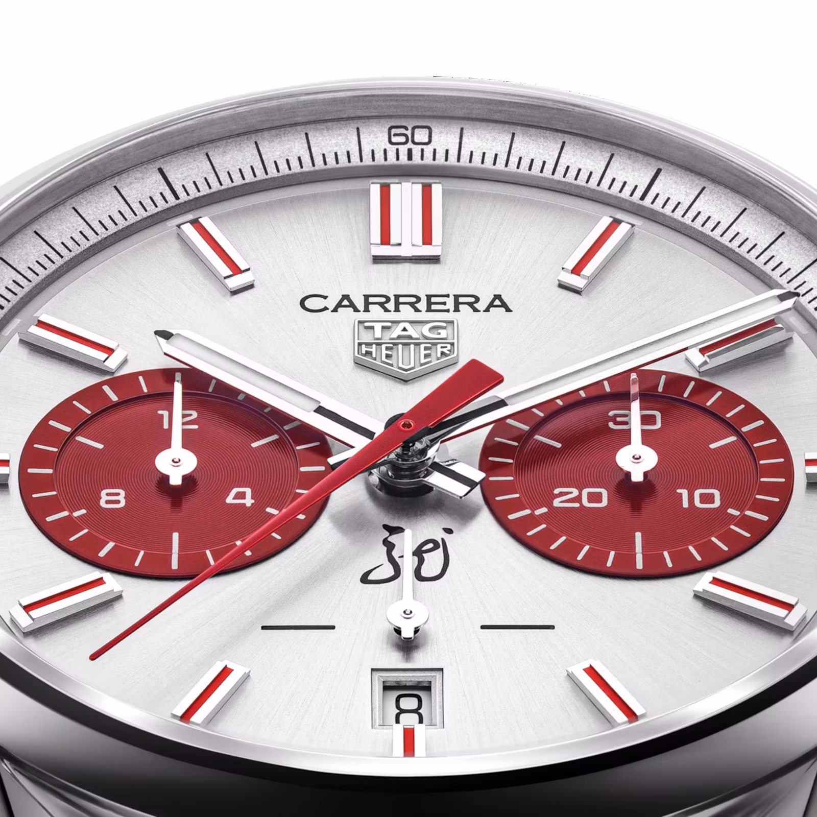 Offering a bold interpretation of the Carrera's emblematic reverse panda dial design, the silver sunray brushed dial with red azurage sub-dials at 3 and 9 o'clock, a date display, and the Chinese Dragon symbol.