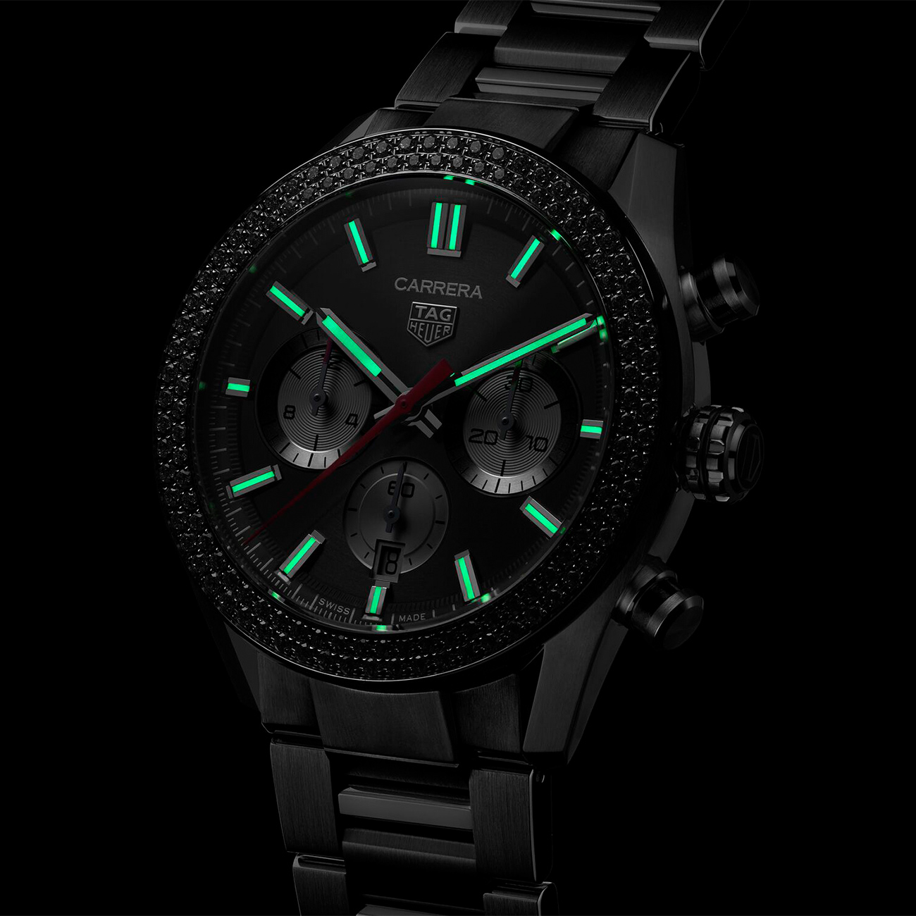 - Dial: Black with hand applied indicies & silver registers
