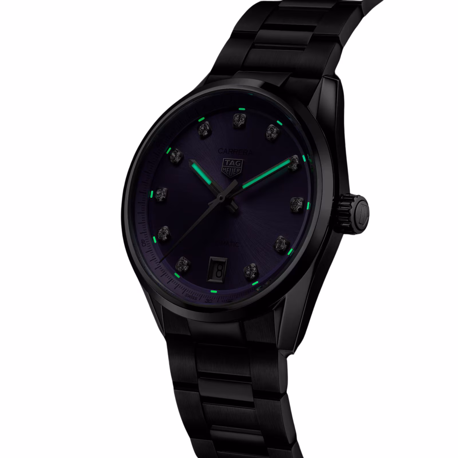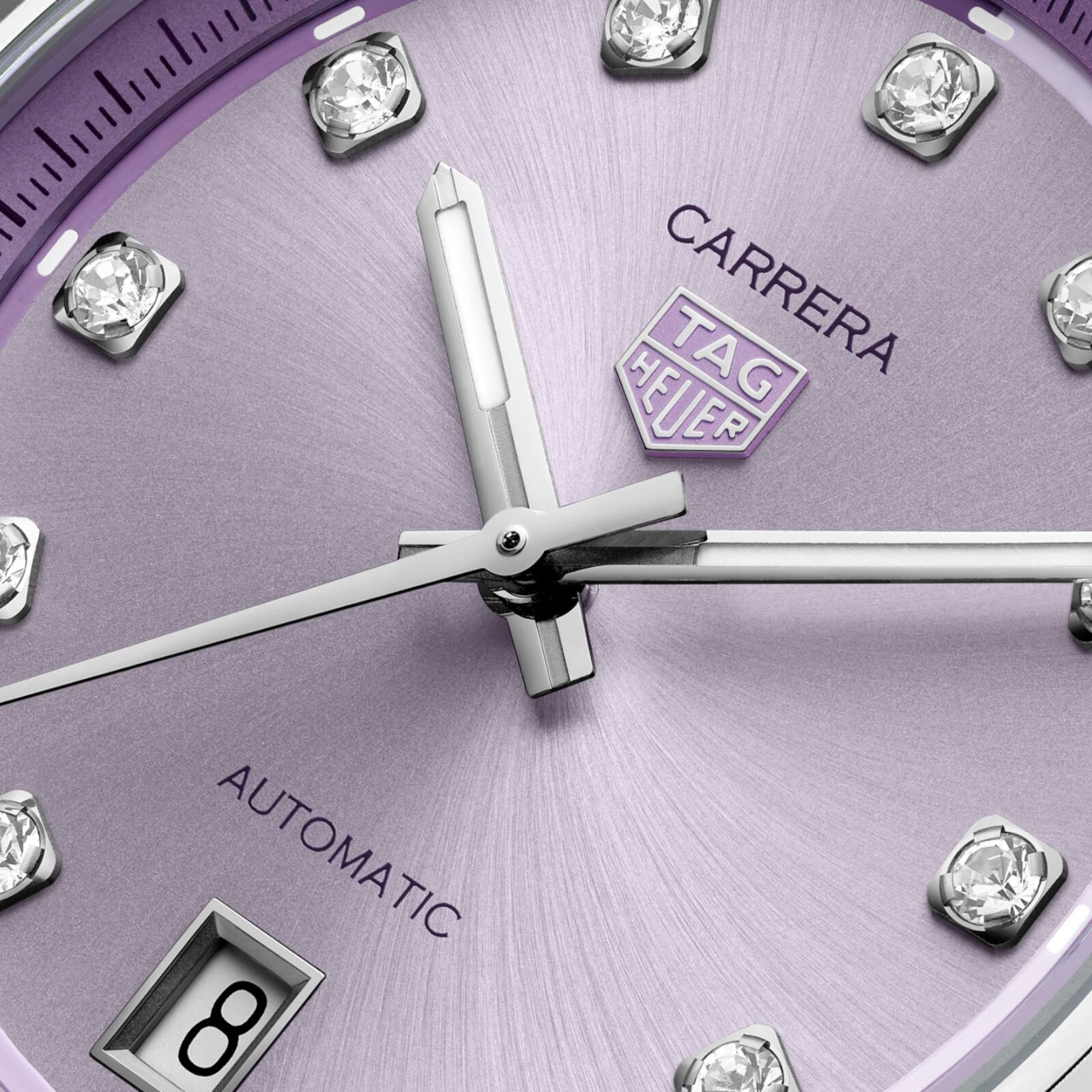 The TAG Heuer Carrera Date in 36 mm brings a fresh touch to the collection with a captivating lilac dial. Featuring diamond-set indexes and powered by the Calibre 7 movement, this timepiece combines elegance with precision.