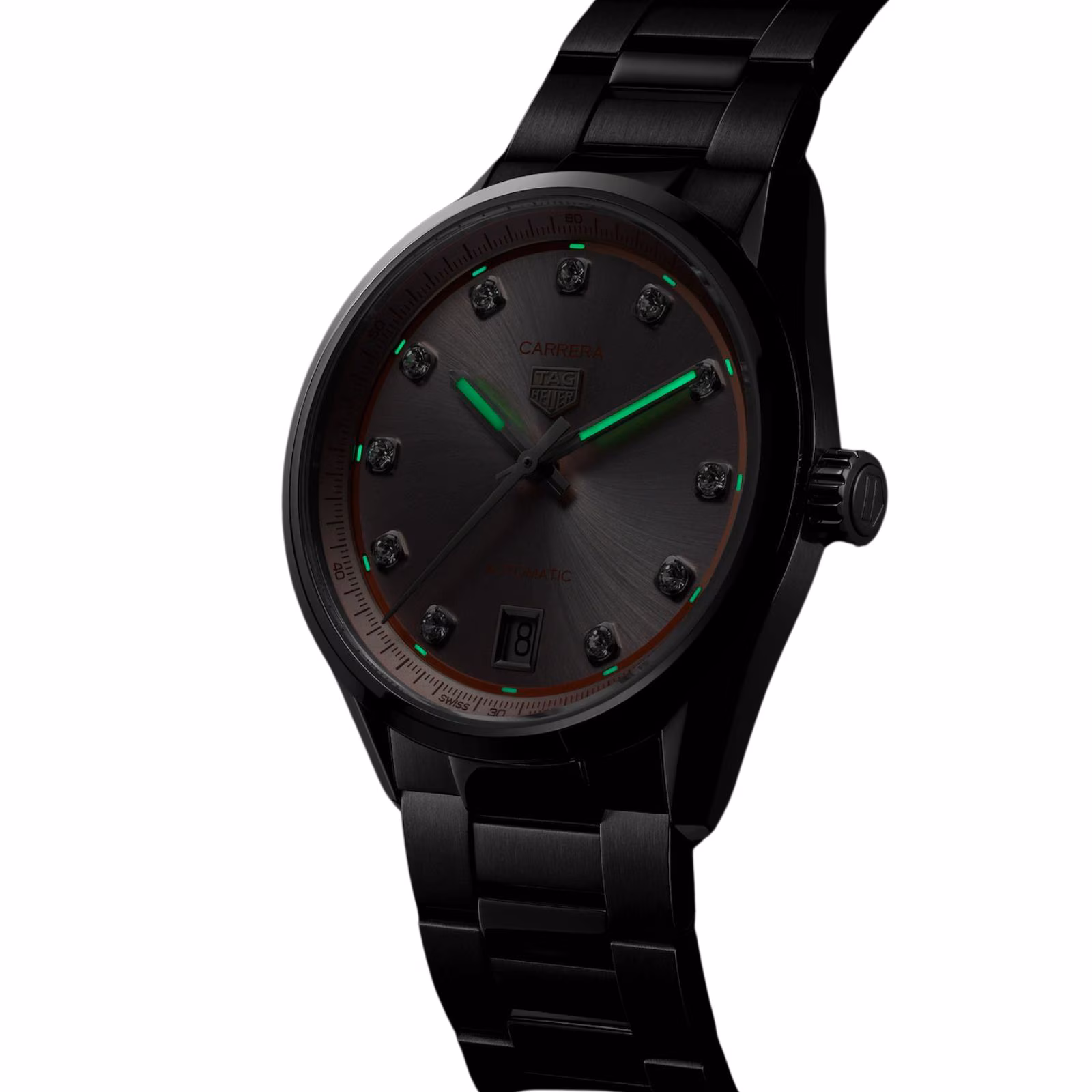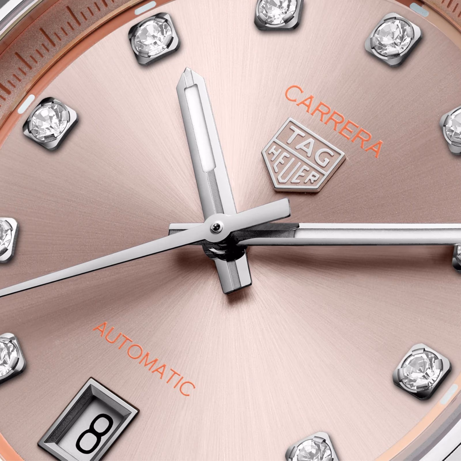 The powdery pink sunray-brushed dial creates a feminine and sophisticated look, accented by a gradient track circling the dial. Diamond-set indexes add a touch of luxury, embodying the spirit of the TAG Heuer Carrera.