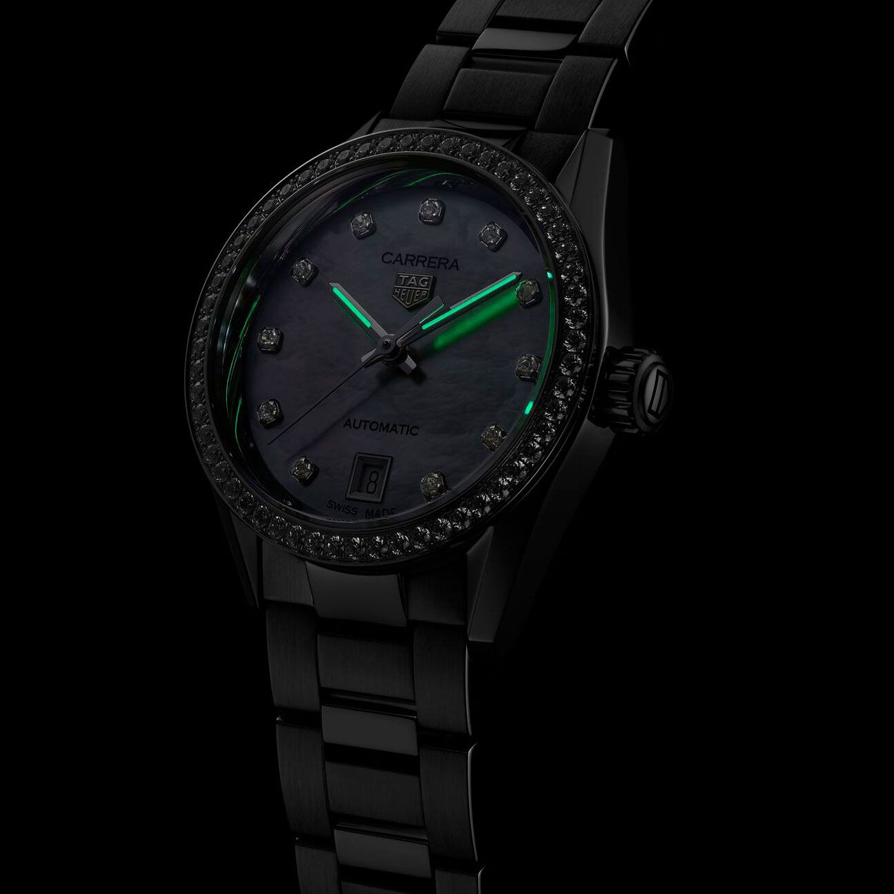 - Ethereal mother-of-pearl dial with dazzling diamond hour markers