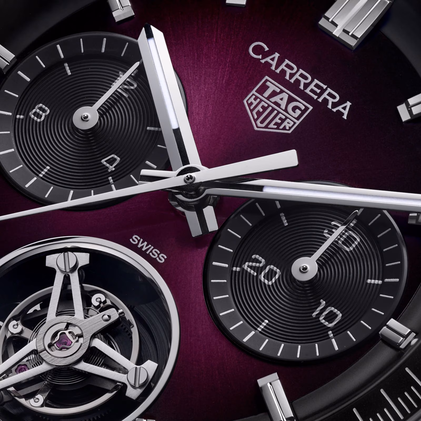 The TAG Heuer Carrera Chronograph Tourbillon combines precision and elegance with a bold new colour. Featuring a smokey purple sunray brushed dial and the in-house Heuer 02 (TH20-09) tourbillon movement, this limited edition timepiece offers unrivaled sophistication for the modern watch connoisseur.