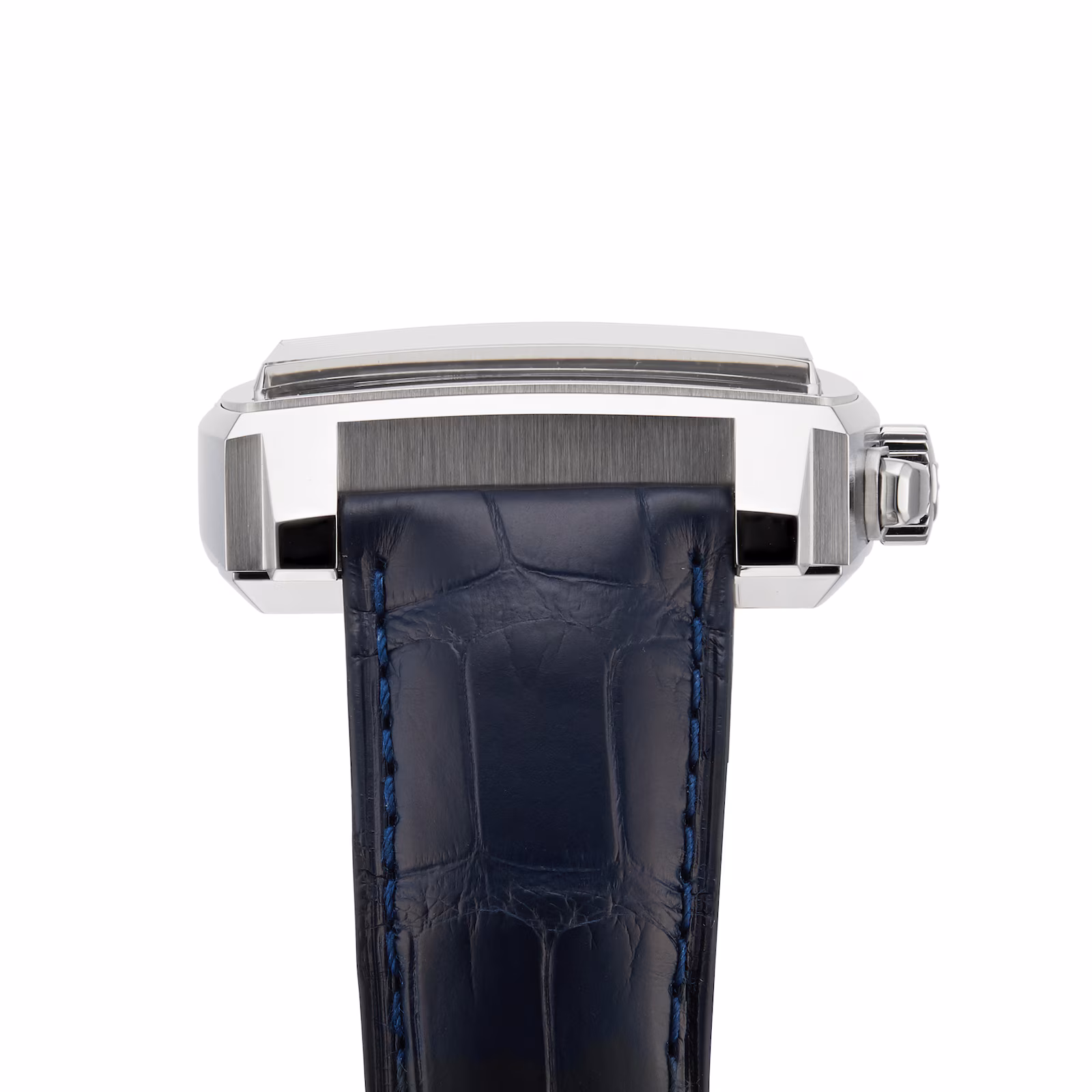 - Statement 39mm steel case with a blue alligator leather racing strap