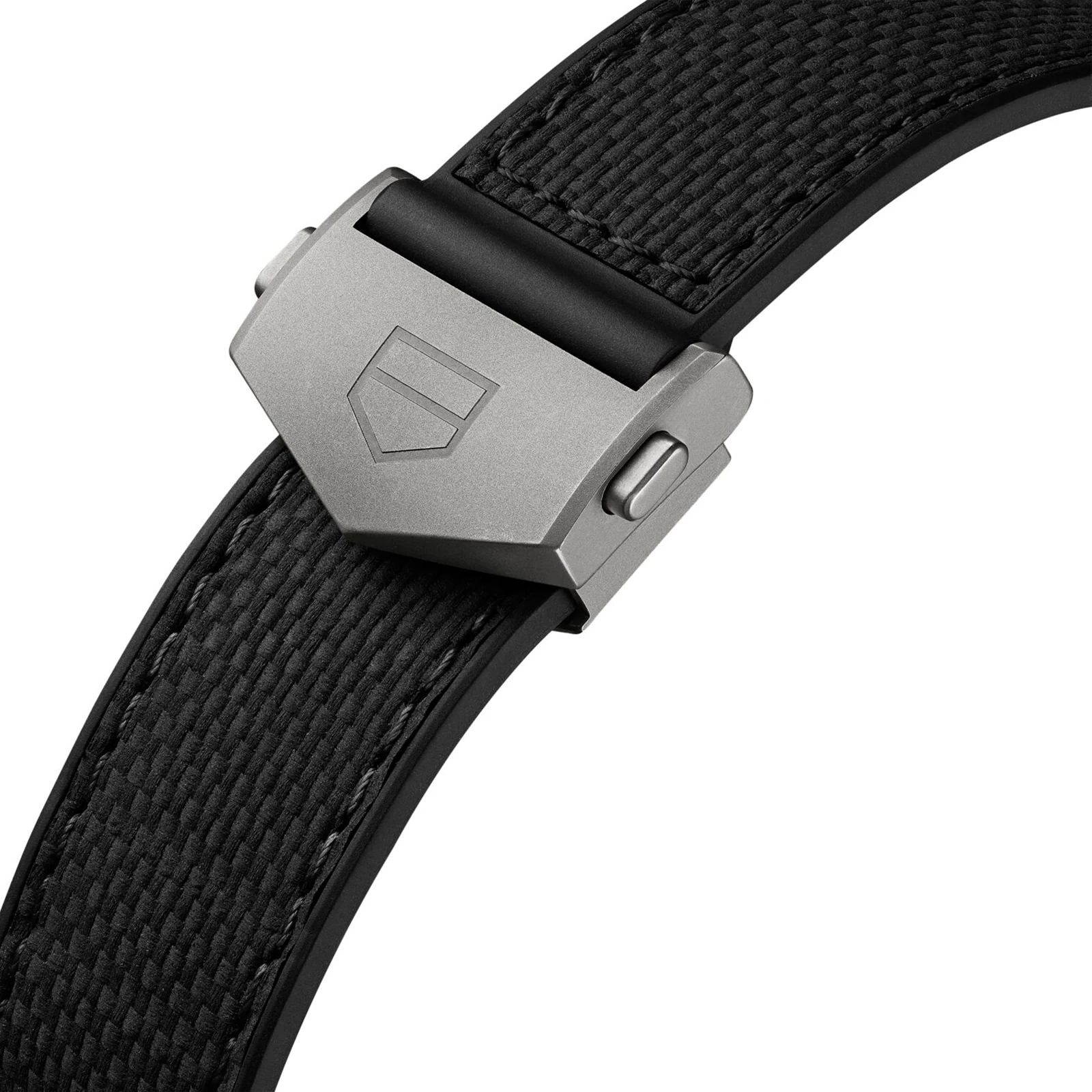 This 39mm model is presented in a square-shaped titanium grade 2 case, secured by a versatile black calf leather and rubber strap.