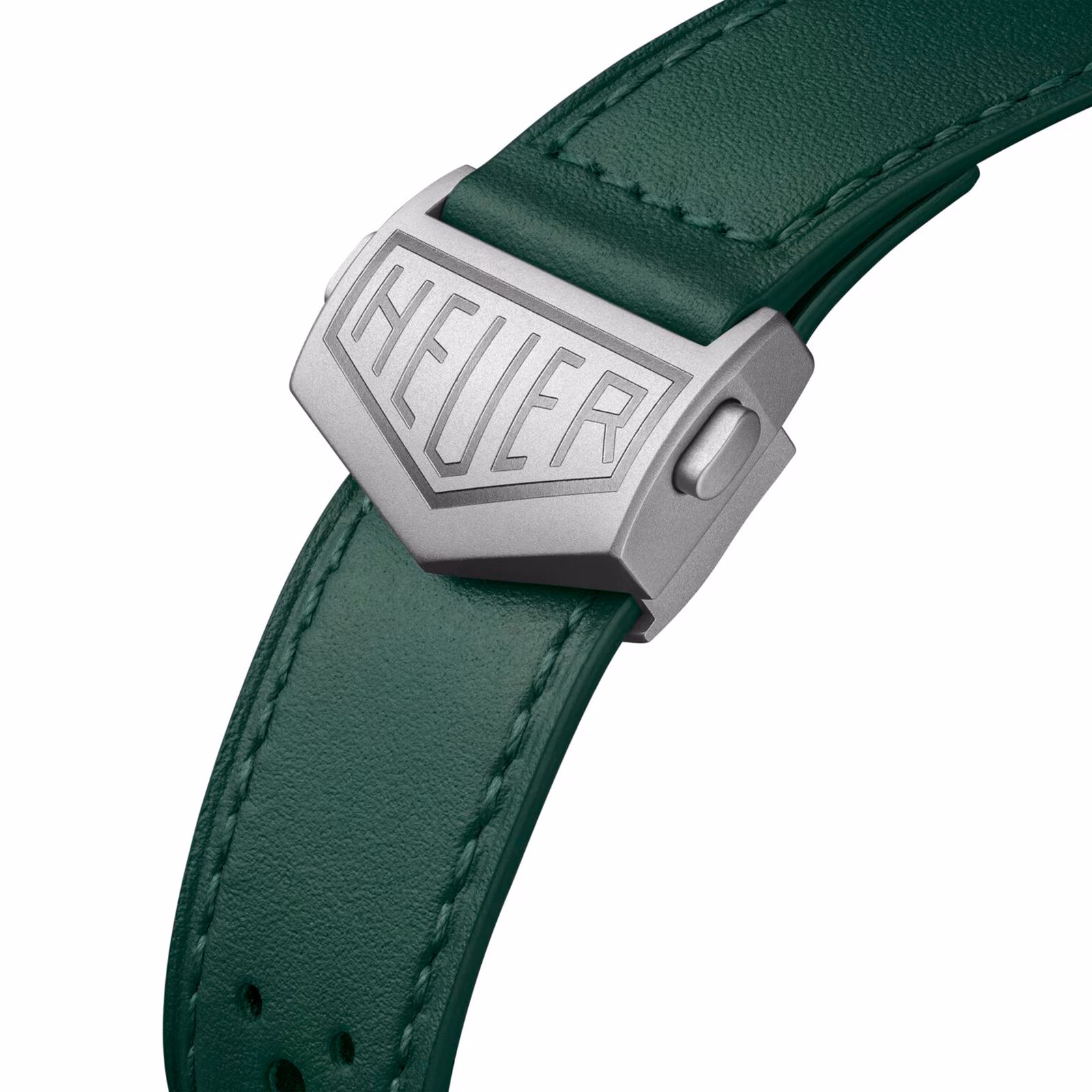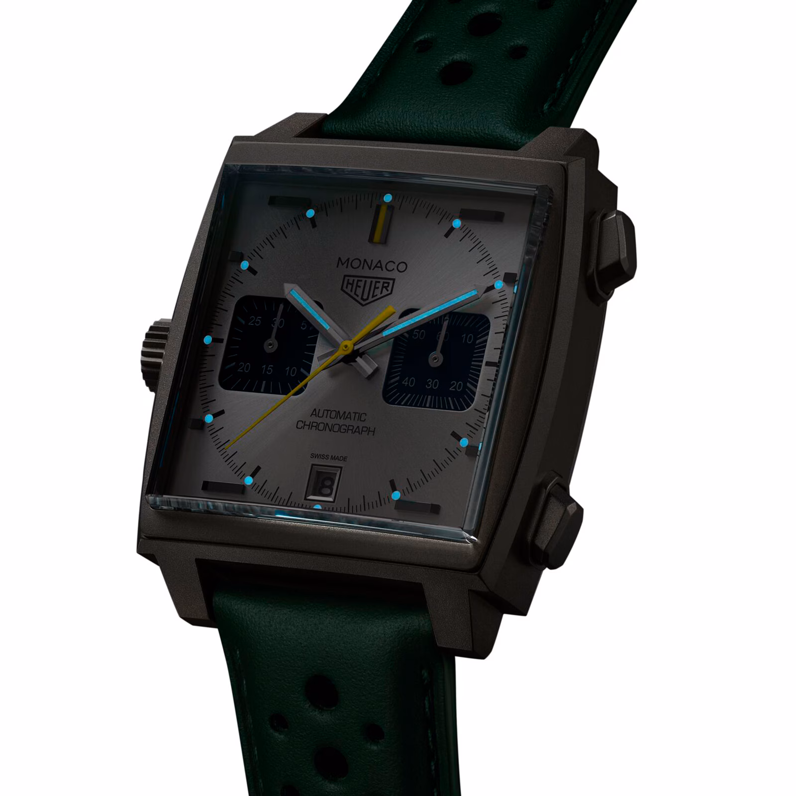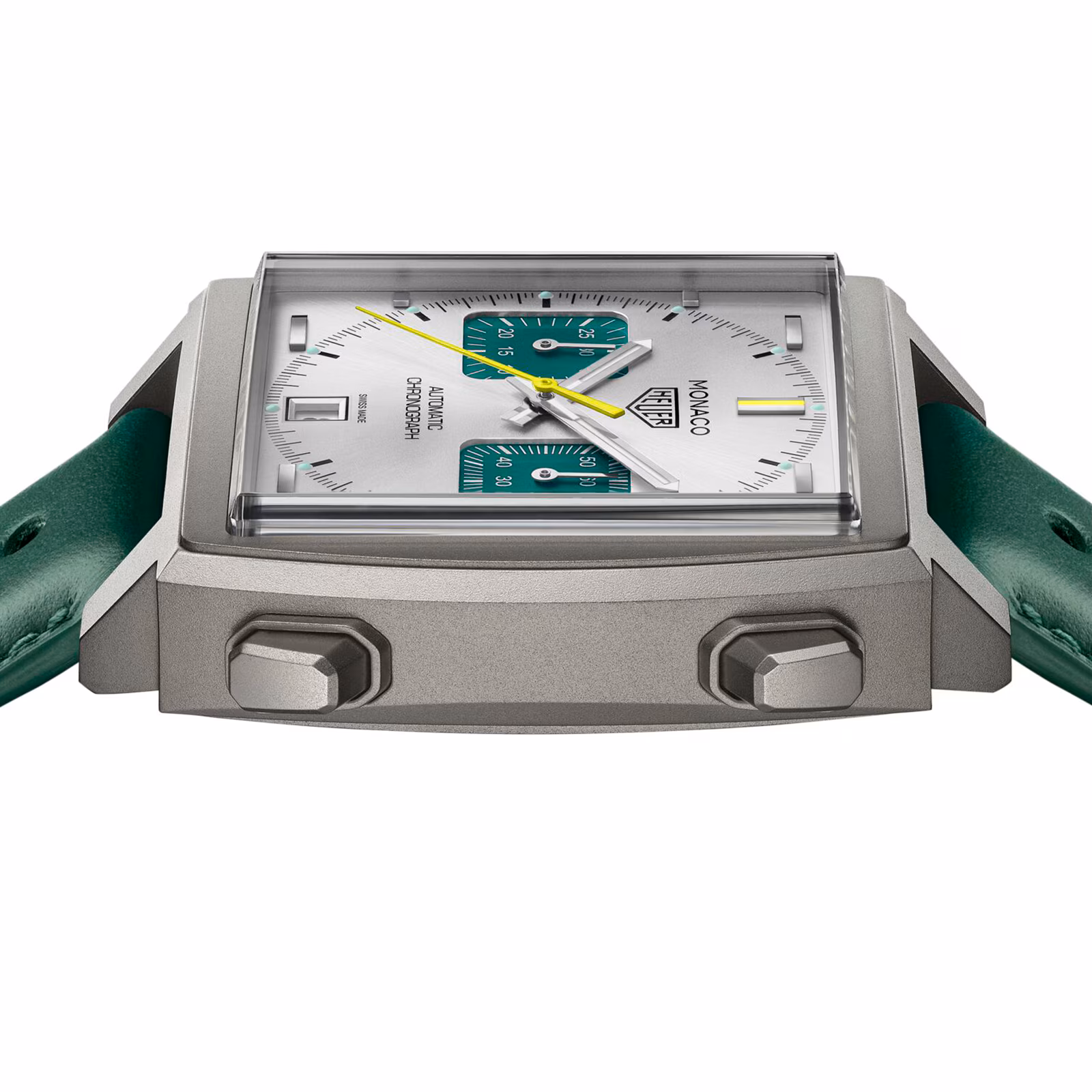 Embrace the racing heritage of the TAG Heuer Monaco Chronograph Racing Green. This 39mm watch, inspired by the Racing Green livery of British drivers, features a silver sunray brushed dial with green and yellow accents. The historic Calibre 11 movement, housed in a lightweight titanium case and paired with a green leather strap, underscores its timeless charisma.