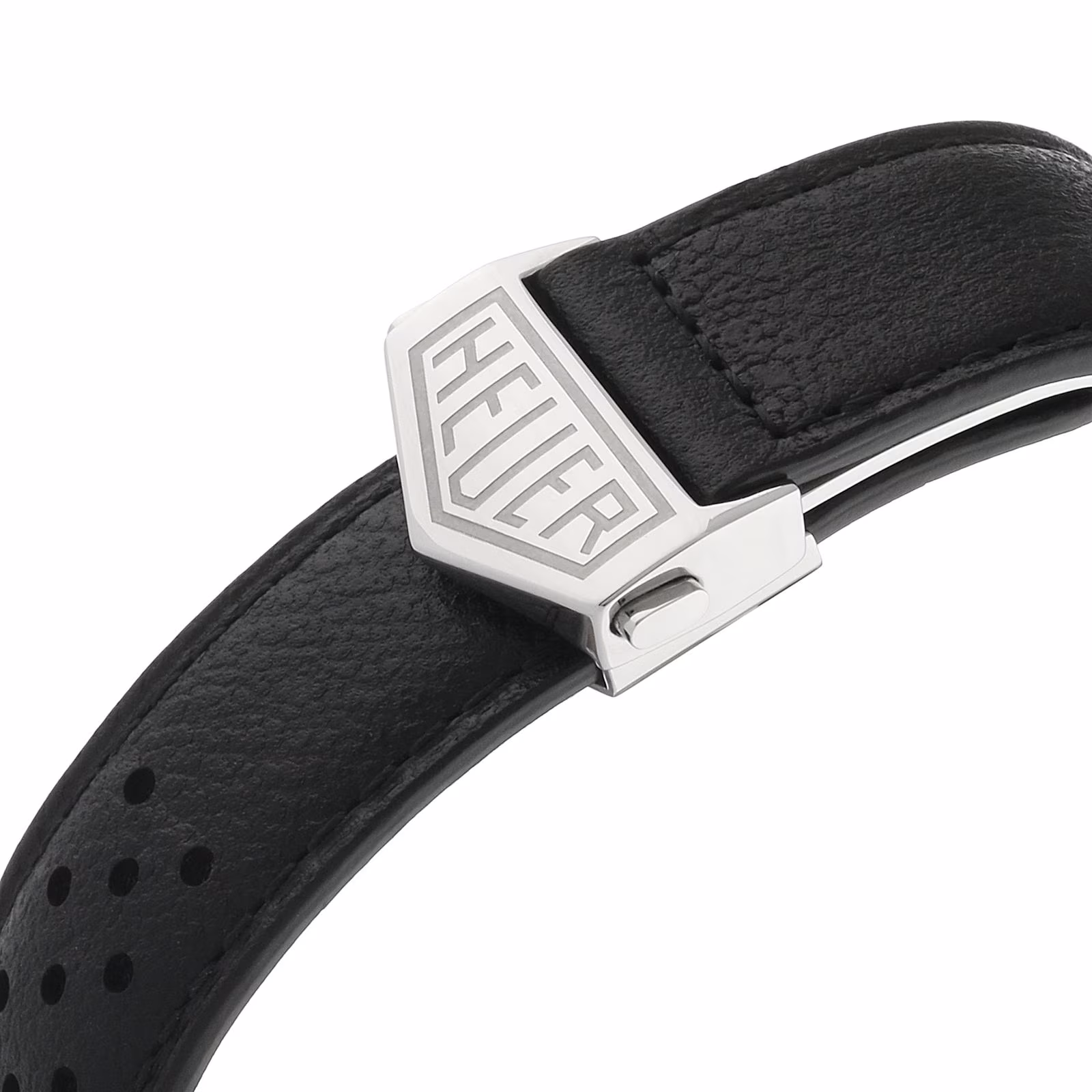 - Statement 39mm steel case with a black leather strap inspired by race tracks